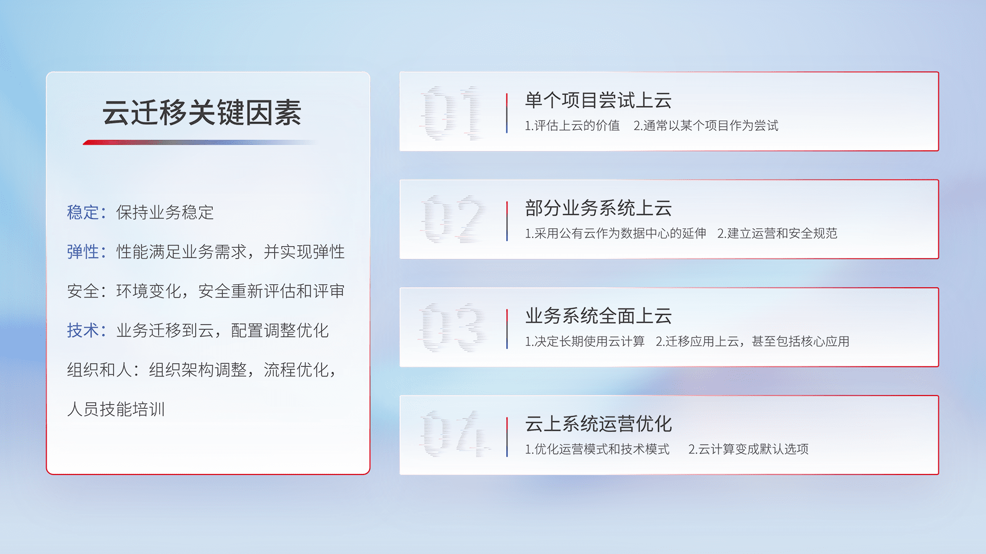 结合实际业务,,,,从规划设计、、云平台选型、、云原生改造、、、数据迁移、、、集成交付,,迁移全过程为客户识别最佳上云路径,,做好风险识别管理,,,设计网络架构、、、、身份权限、、、、安全审计合规、、操作审计、、日志审计、、、监控告警策略、、多站点容灾设计等,,,对云上基础设施进行整体规划,,提升IT治理水平,,,以满足弹性、、高可用、、、、高性能的需求。。
